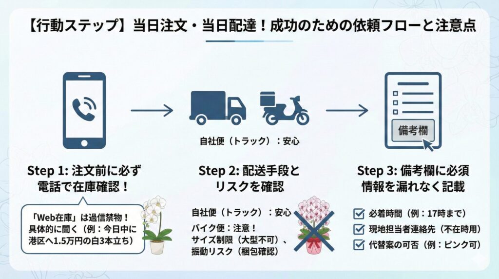 当日配送を成功させるためには、通常のネット注文とは異なるスピード感と確認作業が求められます。以下の手順で確実に手配を進めてください。