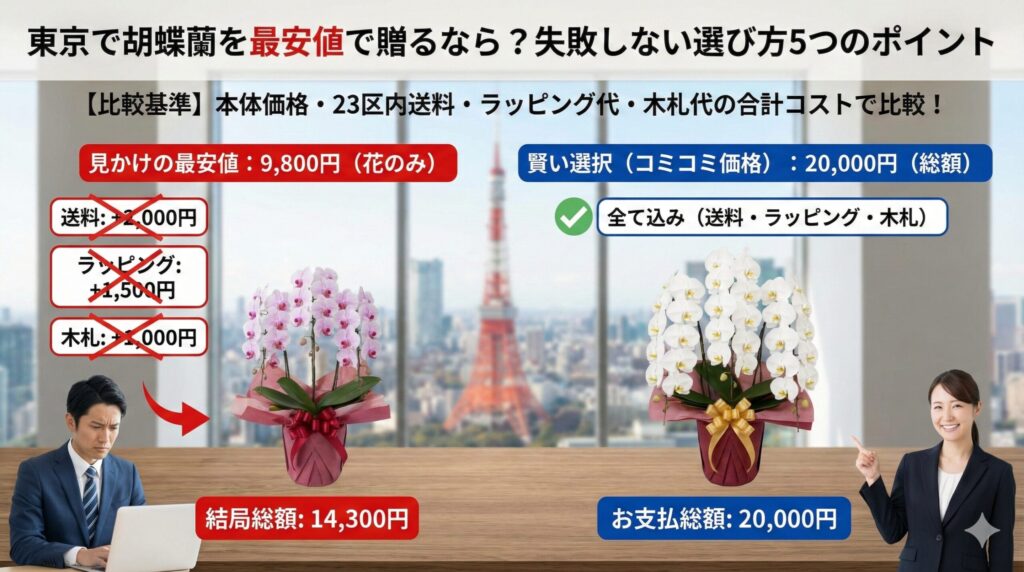 胡蝶蘭を最安値で手配するためには、本体価格の安さに惑わされず、「最終的に支払う総額」で比較することが鉄則です。