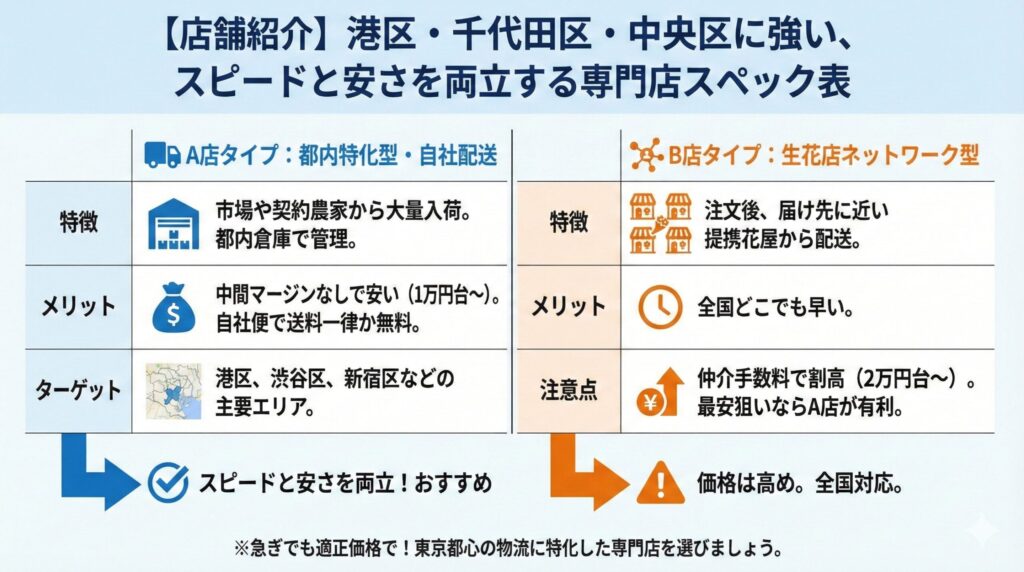 このように、単に「一番安い店」を選ぶのではなく、用途に応じた「許容できる最低ライン」を満たす店の中で最安を探すのが正解です。特に、東京都心のオフィスビルへ贈る場合は、セキュリティや搬入ルールが厳しい場所も多いため、配送実績が豊富なショップを選ぶことも隠れたコスト削減(トラブル対応の手間削減)につながります。