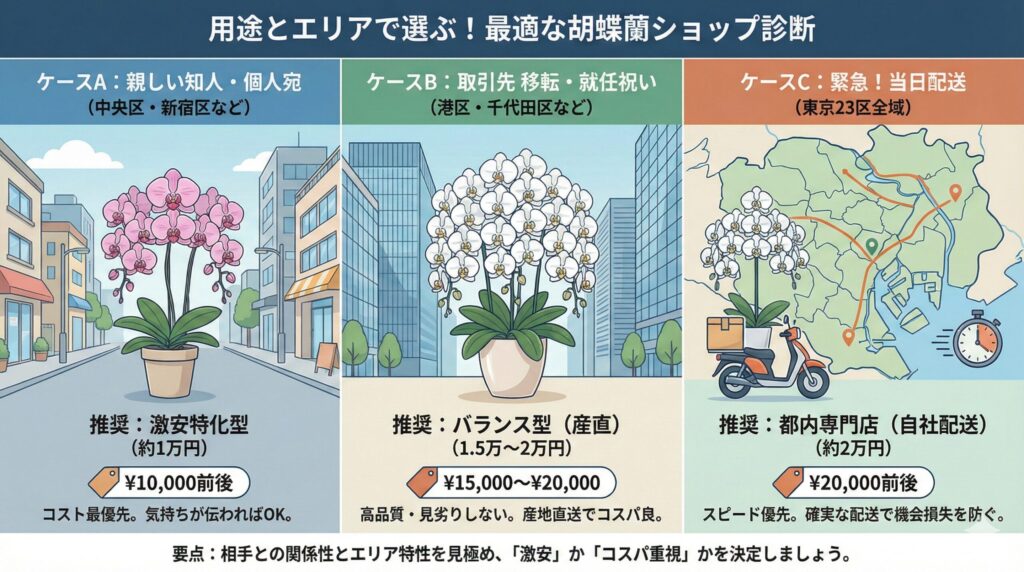 贈る目的と届け先のエリアによって、選ぶべき「最安ショップ」のタイプは明確に異なります。自身の状況に合わせた最適な選択肢を知ることが、コストと品質のバランスを最適化する鍵です。