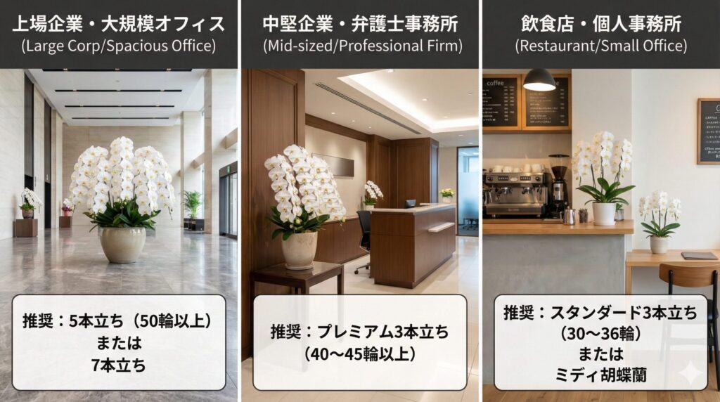 - 上場企業・大規模オフィス(受付が無人または広大なホール) 推奨:5本立ち(50輪以上)または7本立ち 理由:広大な空間では3本立ちだと貧弱に見えるため。また、多数の花が並ぶため、物理的な幅と高さで差別化を図る必要がある。