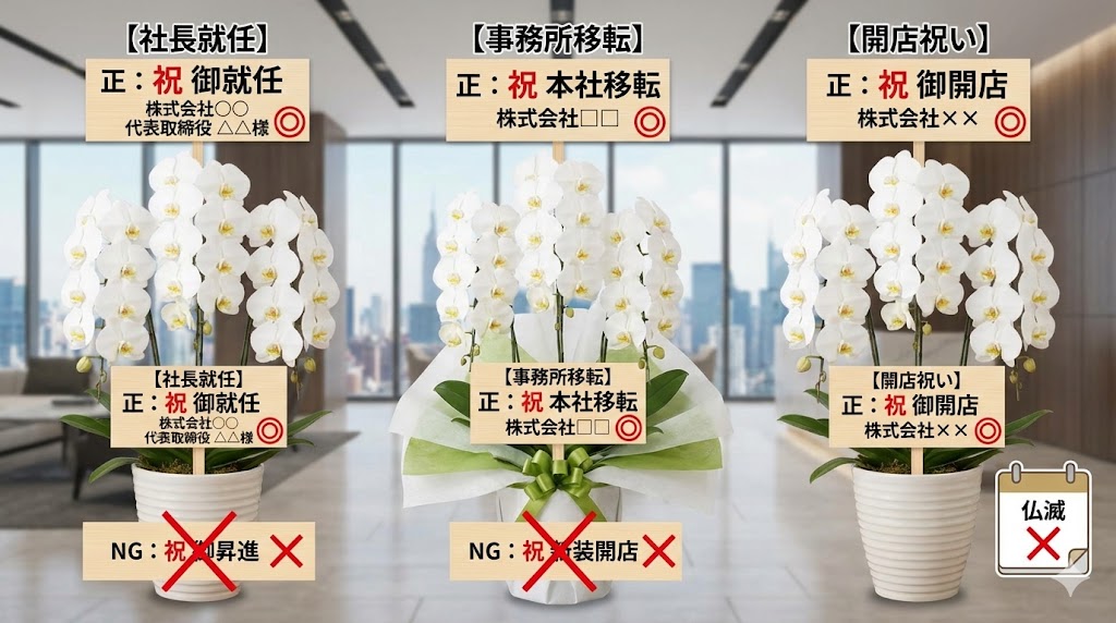 - 事務所・本社移転祝い 正:「祝 御移転」「祝 本社移転」 NG:「祝 新装開店」(店舗ではないため不適切)、「祝 リニューアル」(軽い印象を与える)。また、火事を連想させる「赤色」のラッピングや花材は避けるのが伝統的なマナーですが、木札の「祝」の字は赤色(朱書き)が基本です。