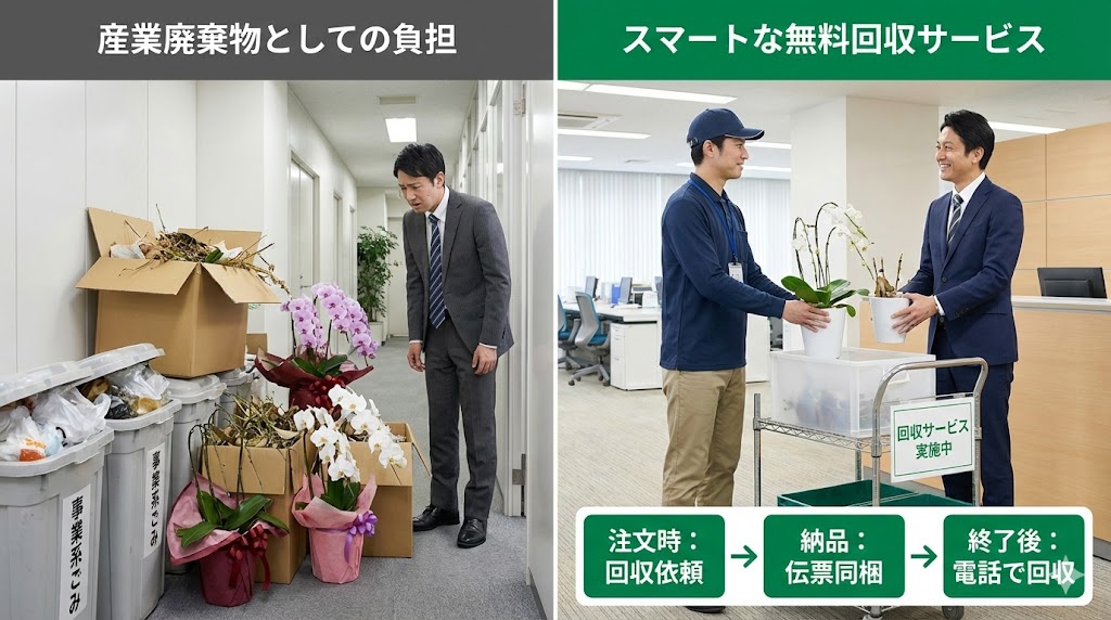 ここで圧倒的な差別化要因となるのが、花屋による「鉢の回収サービス」です。一部の優良な胡蝶蘭専門店では、納品時に回収依頼用の伝票を同梱したり、後日電話一本で無料で引き取りに来てくれたりするサービスを提供しています。これは単なるアフターサービスではなく、相手企業のコスト(処分費用と人件費)を肩代わりする行為に他なりません。