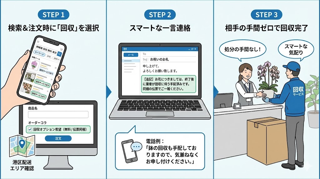 まず、店舗選びの段階で「胡蝶蘭 回収 無料 東京」や「港区 胡蝶蘭 回収」といったキーワードで検索し、回収サービスを明記しているショップを選定します。注文フォームの備考欄やオプション選択で、「回収希望」や「回収伝票の同梱」に必ずチェックを入れてください。中には「自社配送エリアのみ回収可」という条件の店も多いため、届け先が港区(配送エリア内)であることを再確認しましょう。