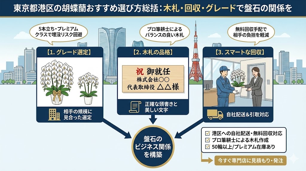 東京都港区の胡蝶蘭おすすめ選び方総括:木札・回収・グレードで盤石の関係を